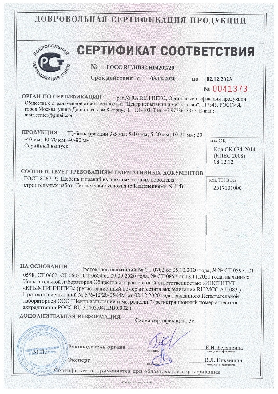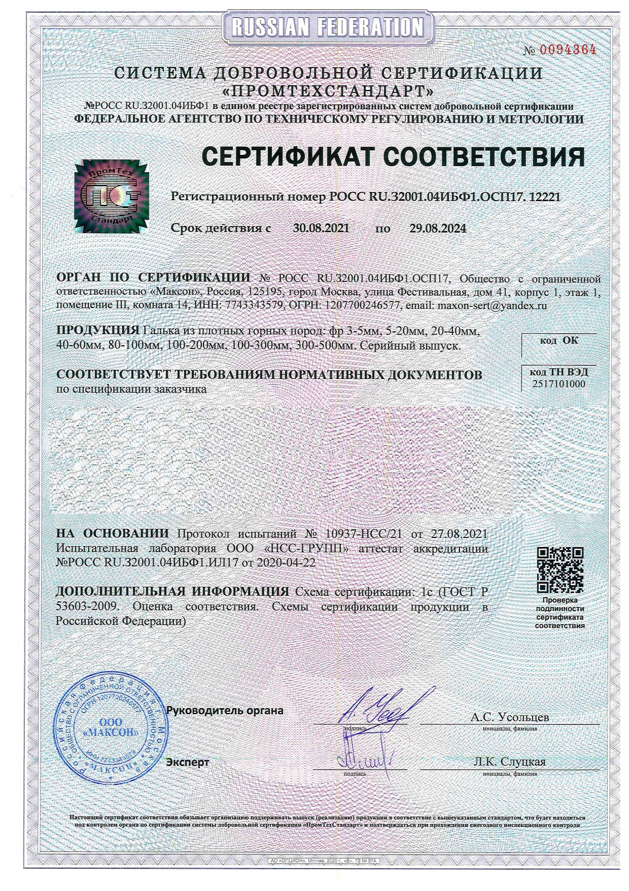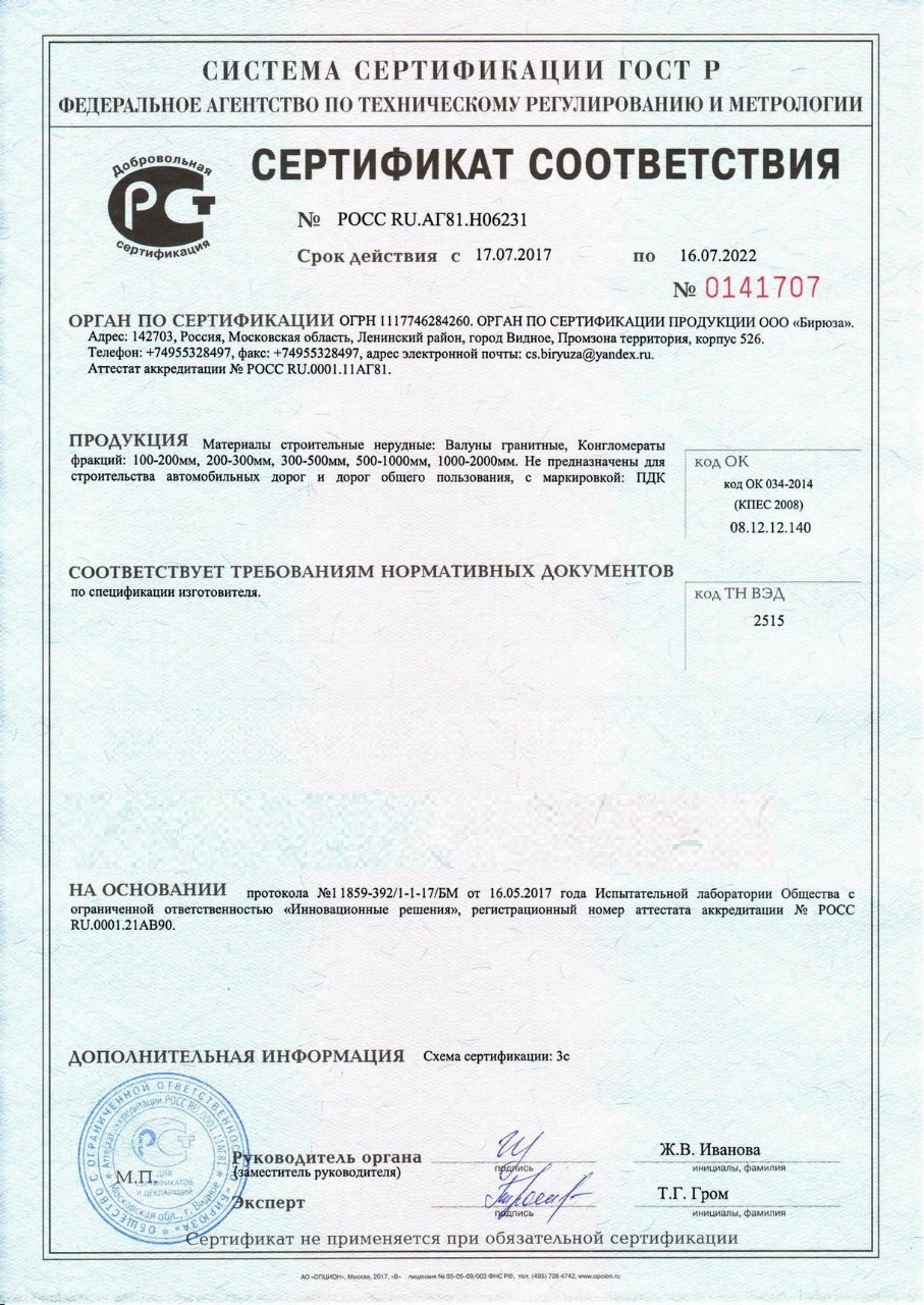 Сертификат соответствия – документ, подтверждающий соответствие продукции требованиям качества и безопасности, установленными для нее действующими стандартами и правилами. Наш камень, который Вы сможете заказать с доставкой в Таганроге , обладает всеми необходимыми документами для реализации и при необходимости могут быть предоставлены все необходимые подтверждающие документы при поставке.